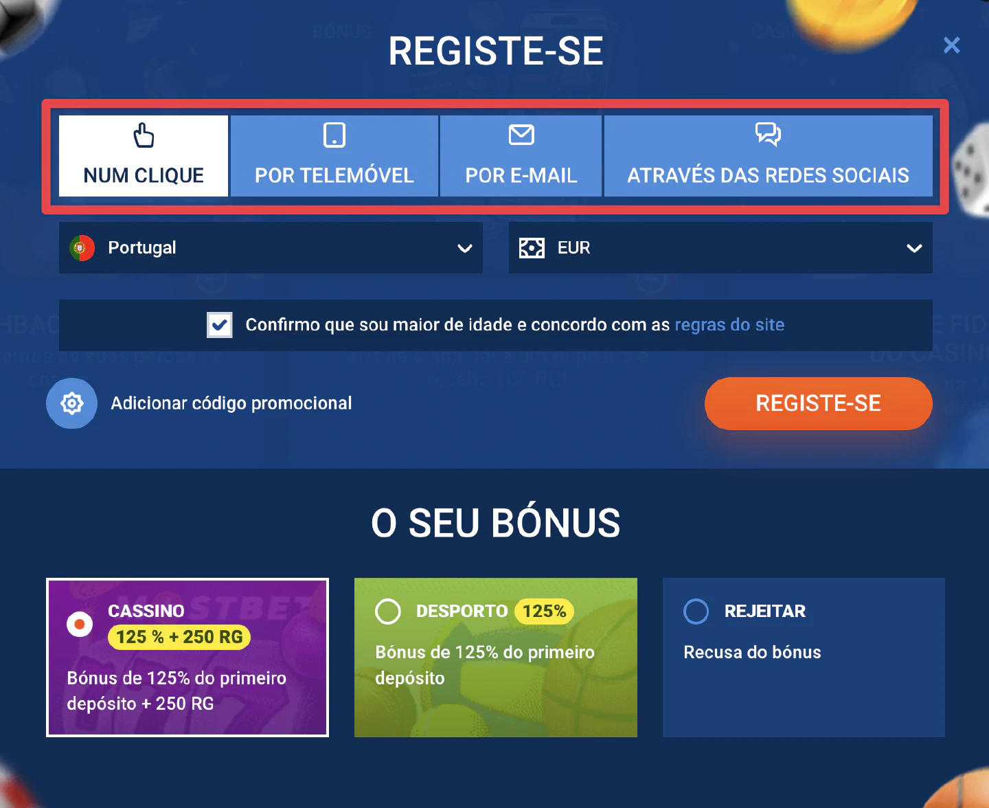 - Registo num clique (se disponível): Escolha o país (Portugal) e a moeda (EUR). O sistema gera automaticamente um nome de utilizador e uma palavra-passe.