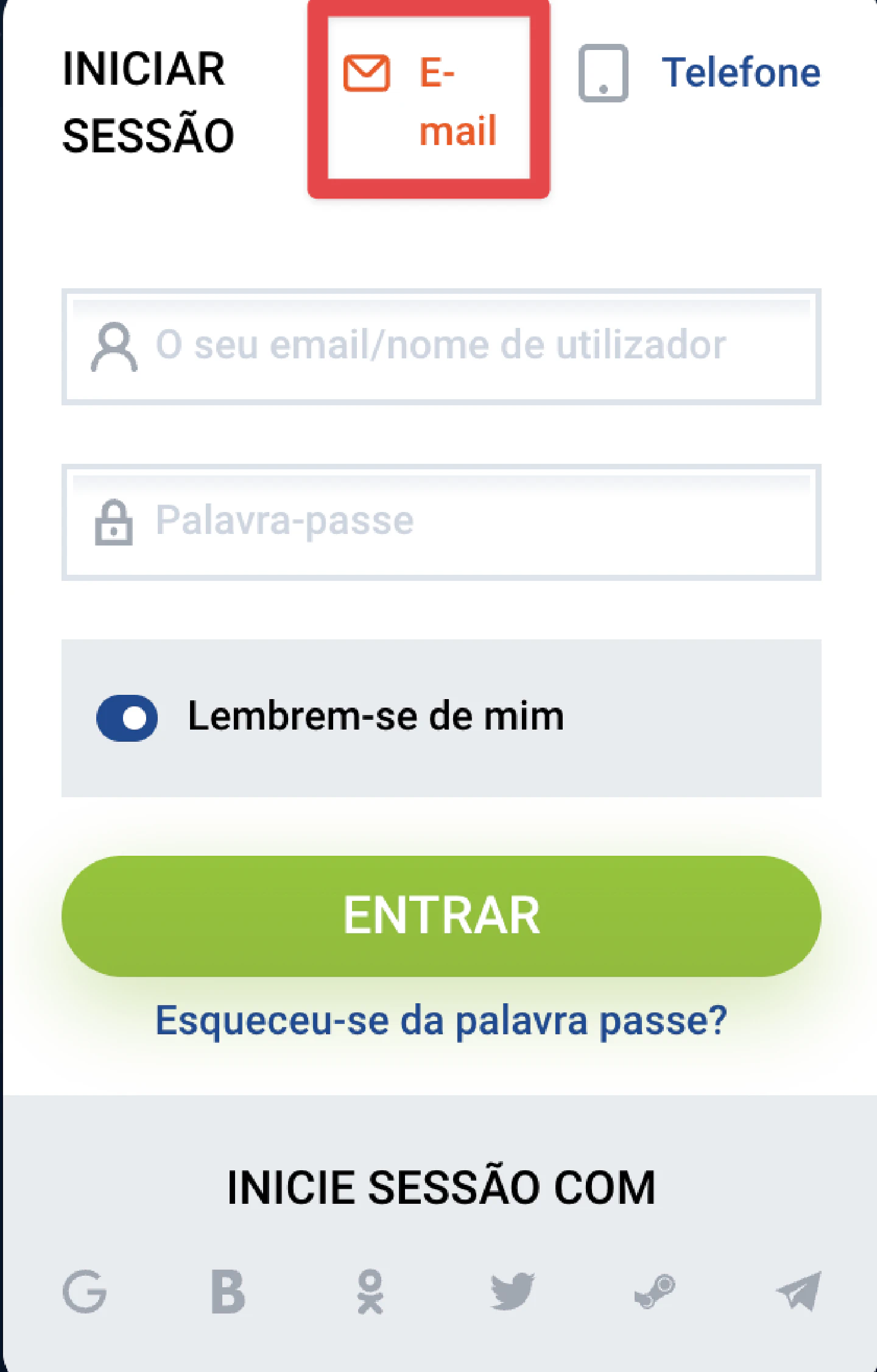 Esta é a forma mais comum de iniciar sessão. Durante o registo, forneceu o seu endereço de e-mail, número de telefone ou foi-lhe atribuído um número de identificação de conta (ID). Utilize um destes dados como nome de utilizador.