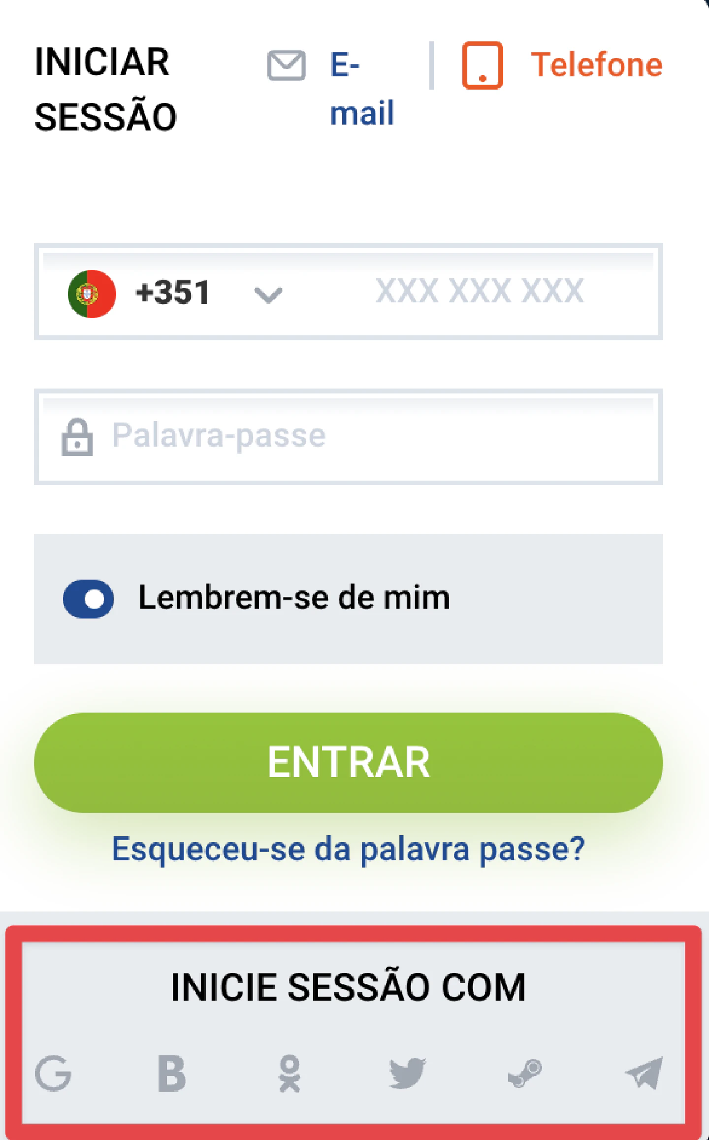 Basta clicar no botão “Entrar” na página inicial da MostBet e, em seguida, selecionar o ícone do serviço que utilizou durante o registo. Será redirecionado para a página de início de sessão desse serviço (se ainda não tiver sessão iniciada). Após iniciar sessão e autorizar a MostBet, regressará automaticamente à sua conta no site. Rápido, prático e seguro!